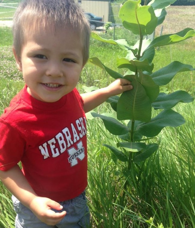* Photo – While on a road trip to Nebraska to visit family, we stopped along a roadside off of I-29 in Iowa to feed baby Elsie. Daniel and I decided to go on a short walk and explore the Common Milkweed plants growing in the ditch along the gravel road. After turning over a few leaves… there it was… a tiny Monarch caterpillar! We found one… I could not have planned it any better even if I had tried. Daniel was so excited that he didn’t mind posing for a picture with his new little friend. (June, 2015)